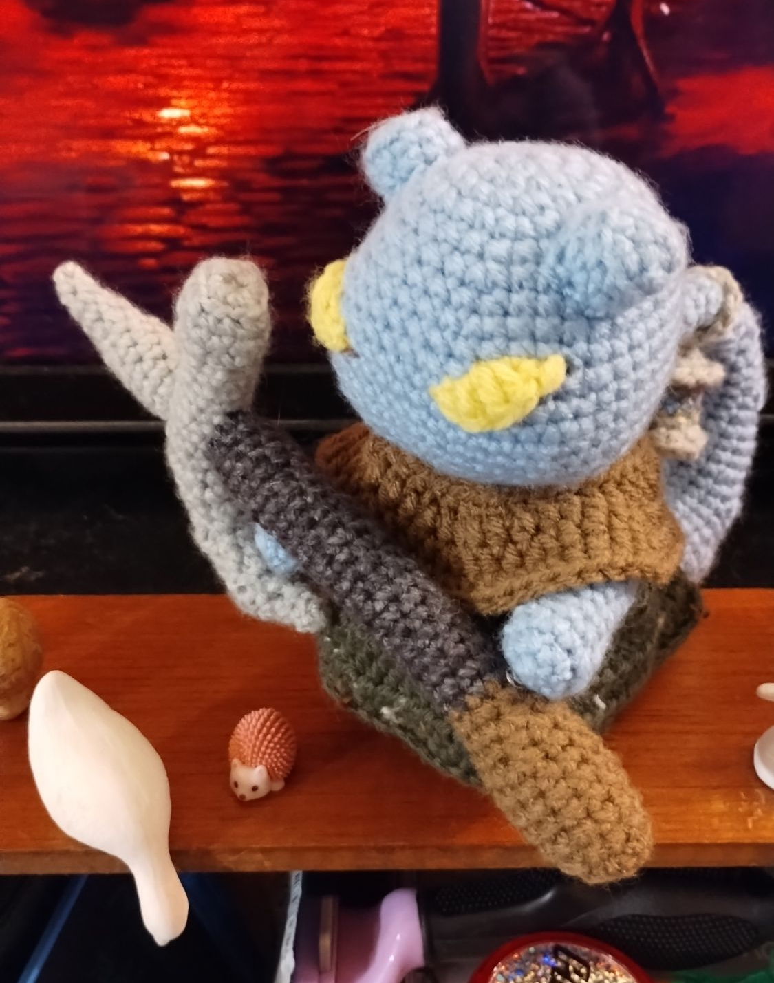 Meet Charmen, my most ambitious completed project to date. He’s a tiefling based on a DND character. I used a tonberry pattern with some modifications and my own original lucerne and outfit design.