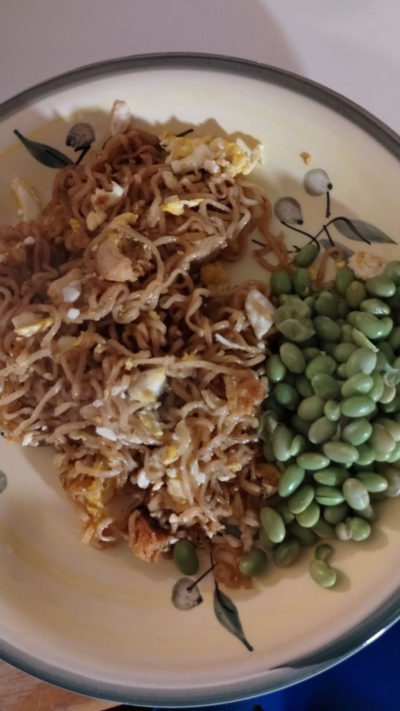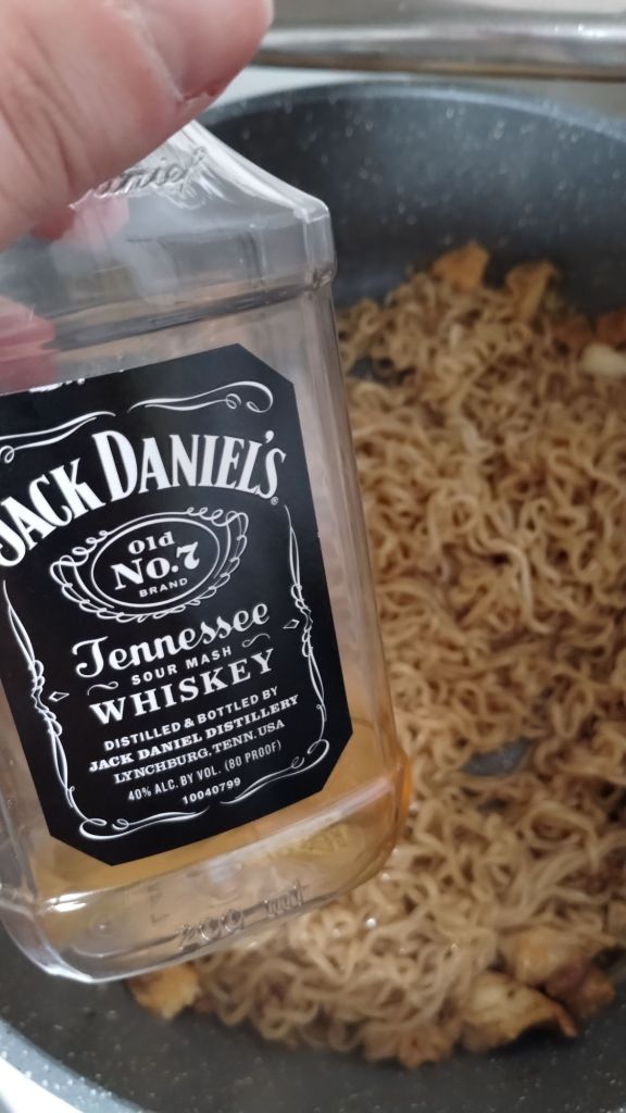 - Scoop the the noodles into an oiled/buttered frying pan. get whiskey, drink whiskey, pour some whiskey on the noodles and add spices. add some water so spices mix easily. Then move the noodles to the side and add an egg in the center. When it’s semi cooked then cut it up and mix with noodles.